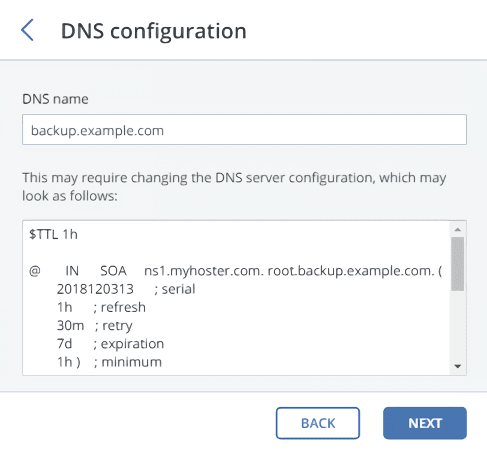 7. On the DNS Configuration pane, specify the external DNS name for this gateway, for example, backupgateway.example.com. Make sure that each node running the gateway service has a port open for outgoing Internet connections and incoming connections from your Acronis backup software. The backup agents will use this address and port to upload the backup data. Click Next.