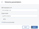 6. On the Volume parameters pane, specify the hostname or IP address of the NFS share, the export name, and select the NFS version. NFS4 is recommended, as it provides better scalability and performance compared to NFS3, which has limitations in the protocol. Click Next.