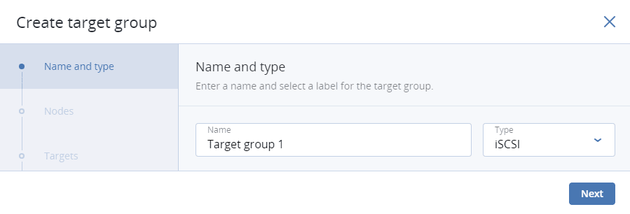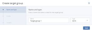 On Name and type, enter a target group name and select a type: iSCSI or Fibre Channel.