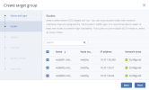 On Nodes, select nodes to add to the target group. On these nodes, iSCSI targets will run. You can only choose nodes with network interfaces that are assigned the iSCSI traffic type. It is recommended to have at least two nodes in the target group to achieve high availability. If you plan to use multiple iSCSI initiators, you should have as many nodes in the target group.