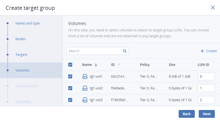 On Volumes, select volumes to attach to target group LUNs. You can select from a list of volumes that are not attached to any target groups. If no volumes are available, you can create them on this step so they are attached to the target group automatically, or attach them manually later. For more information, refer to Managing volumes.