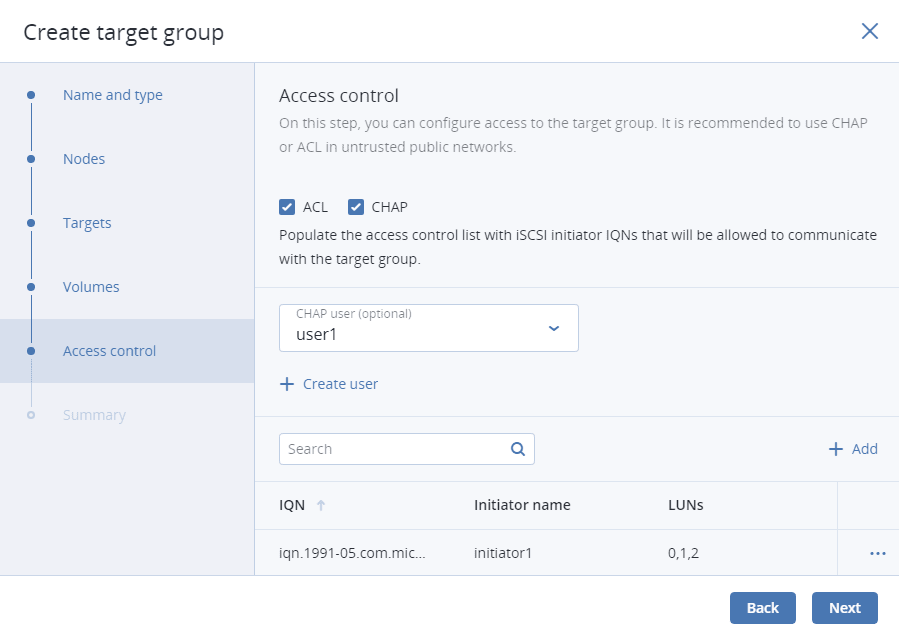 On Access control, configure access to the target group. It is recommended to use CHAP or ACL in untrusted public networks. Without access control, any connections to the target group are allowed. For more information, refer to Restricting access to target groups.