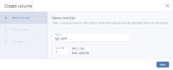 On Name and size, enter a volume name and specify a size in gigabytes. Note that volumes can be extended later but not shrunk.