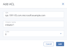 In the Add ACL window, specify the initiator’s IQN, enter an alias, select the LUNs that it will be able to access, and then click Add. The initiator will appear in the ACL.