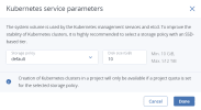 Additionaly, you can change the Kubernetes parameters such as the size and storage policy of the system volume on master nodes. The system volume is used by the Kubernetes management services and etcd. The new parameters will be applied only in new Kubernetes clusters. System volumes in existing Kubernetes clusters will retain their previous parameters. To improve the stability of Kubernetes clusters, it is highly recommended to select a storage policy with an SSD-based tier.