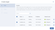 On Nodes, select nodes to add to the target group. On these nodes, iSCSI targets will run. You can only choose nodes with network interfaces that are assigned the iSCSI traffic type. It is recommended to have at least two nodes in the target group to achieve high availability. If you plan to use multiple iSCSI initiators, you should have as many nodes in the target group.