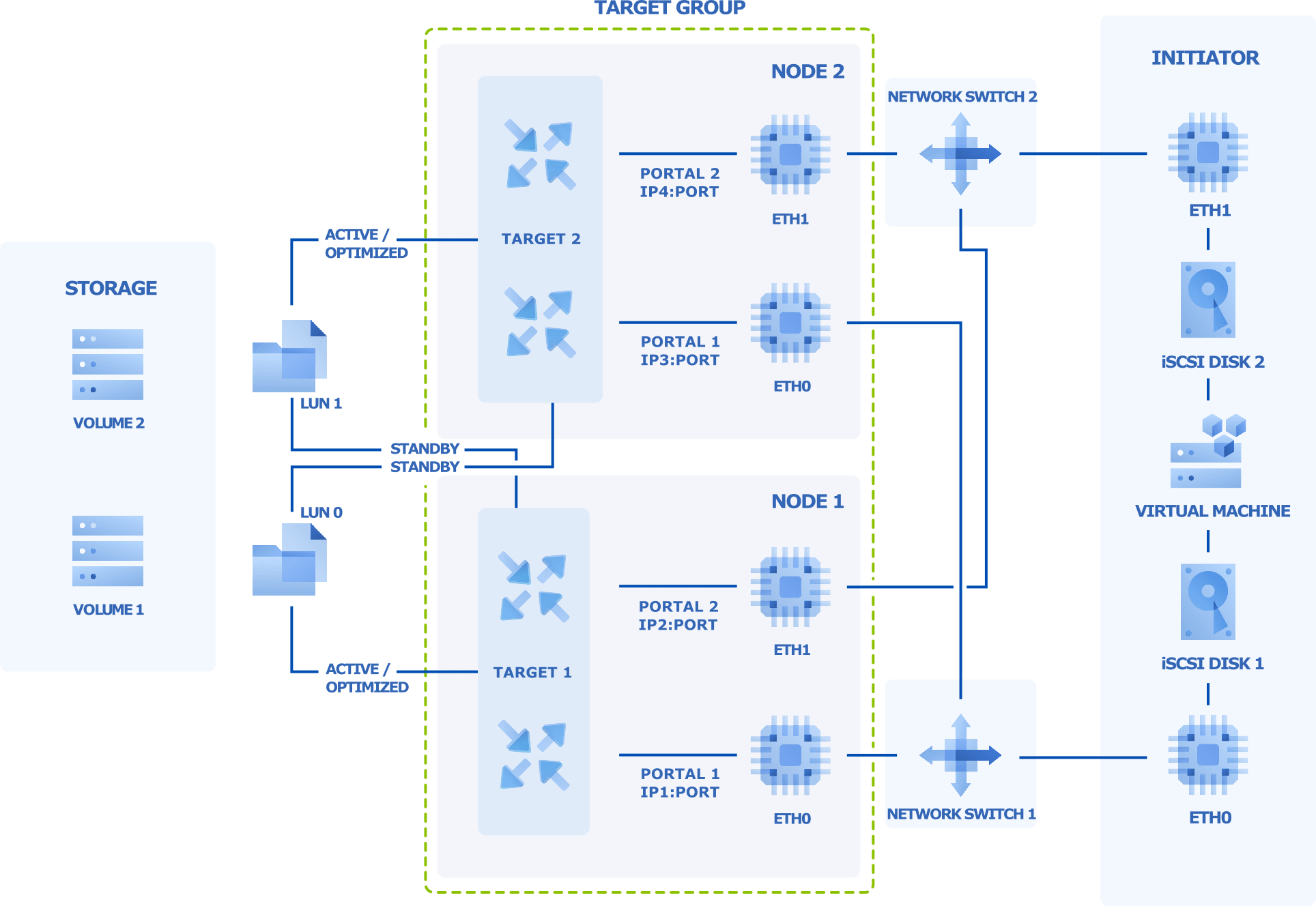 Acronis Cyber Infrastructure allows you to create groups of redundant targets running on different storage nodes. To each target group, you can attach multiple storage volumes with their own redundancy provided by the storage layer. Targets export these volumes as LUNs.