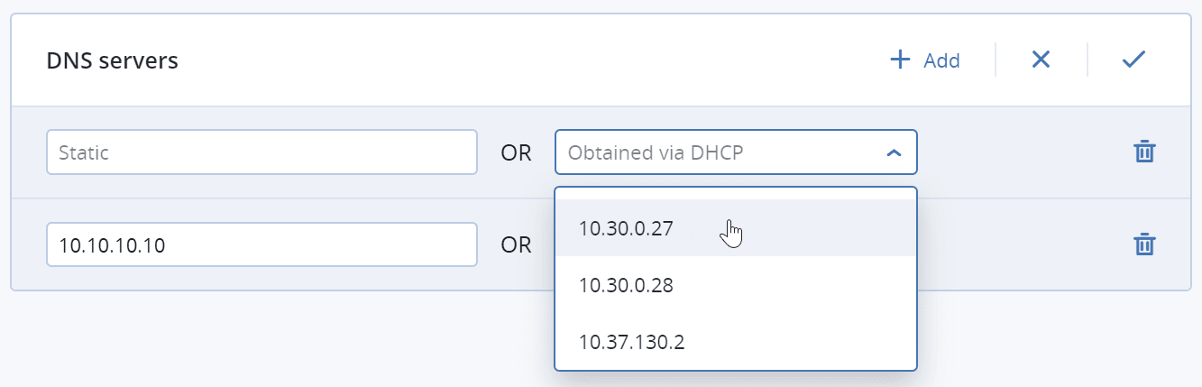 Acronis Cyber Infrastructure features a built-in DNS server that enables discovery of all of its internal services. For resolving external domain names, you can add DNS servers that already exist in your network infrastructure.