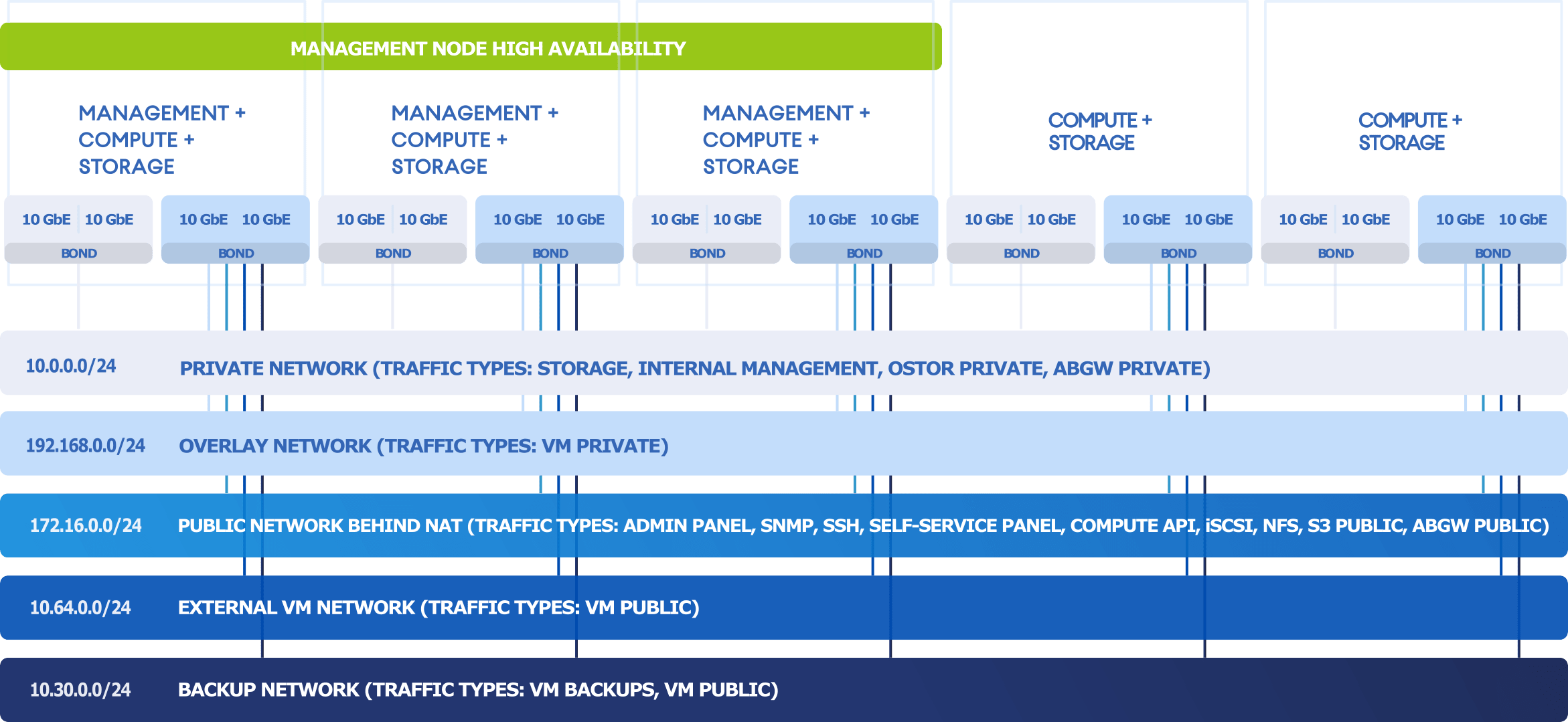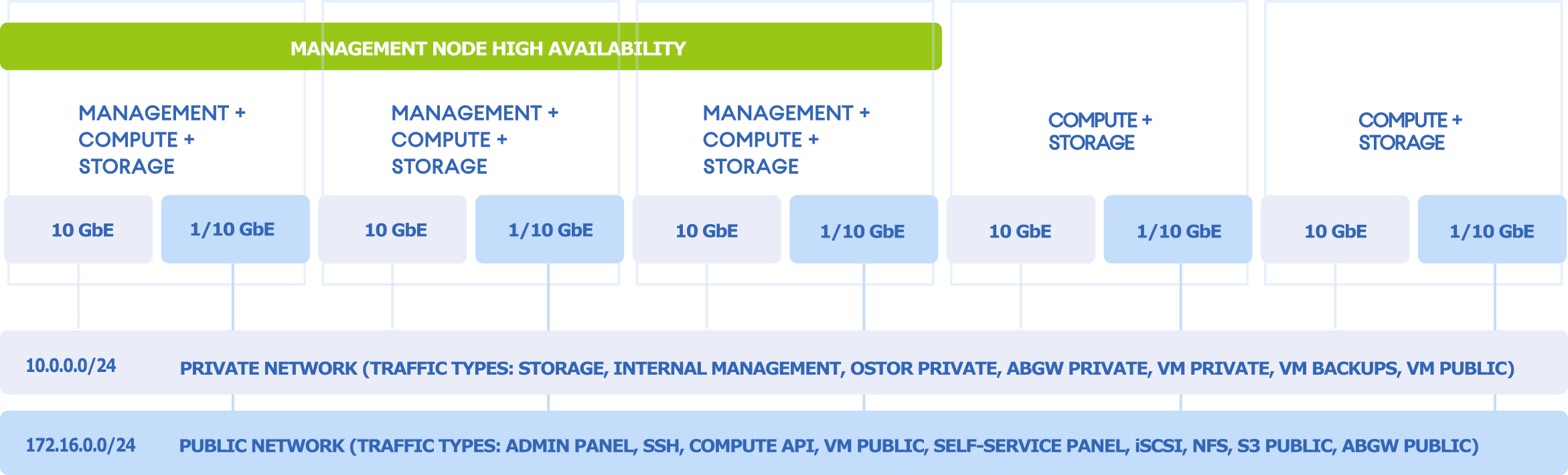 - For management via the admin and self-service panels, compute API, SSH, and SNMP, as well as for public export of iSCSI, NFS, S3, and Backup Gateway data