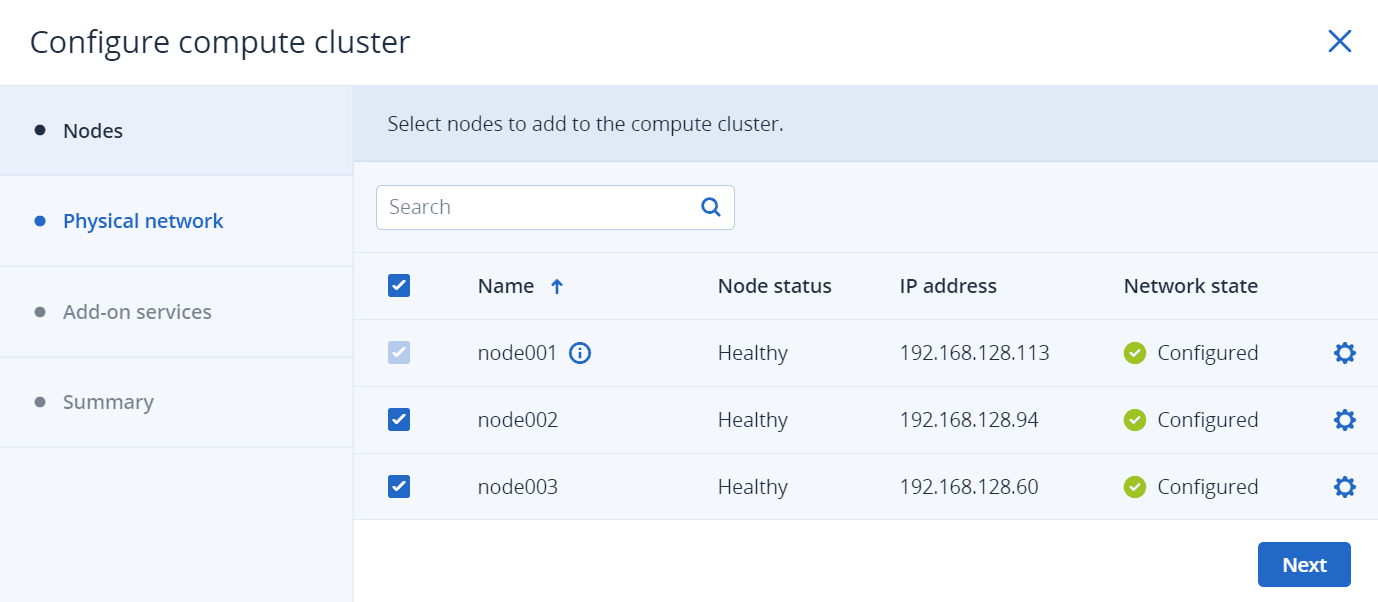- Select the nodes to add to the compute cluster. You can only select nodes with the Configured network state. Nodes in the management node high availability cluster are automatically selected to join the compute cluster.