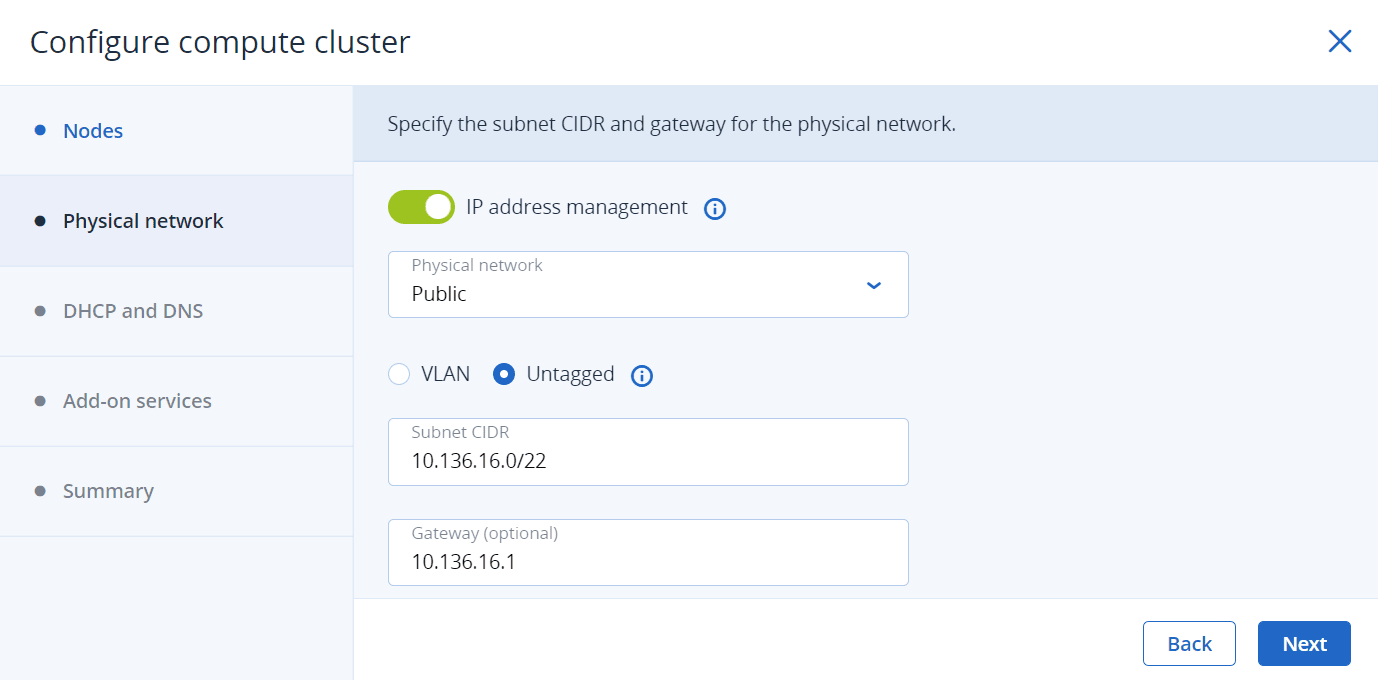 - Select the physical network type: select VLAN and specify a VLAN ID to create a VLAN-based network, or select Untagged to create a flat physical network.
