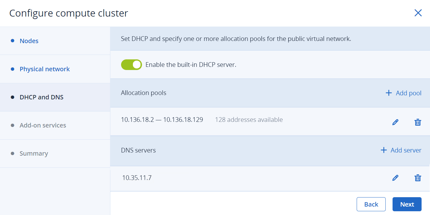 - Specify DNS servers that will be used by virtual machines. These servers can be delivered to VMs via the built-in DHCP server or by using the cloud-init network configuration (if cloud-init is installed in the VM).