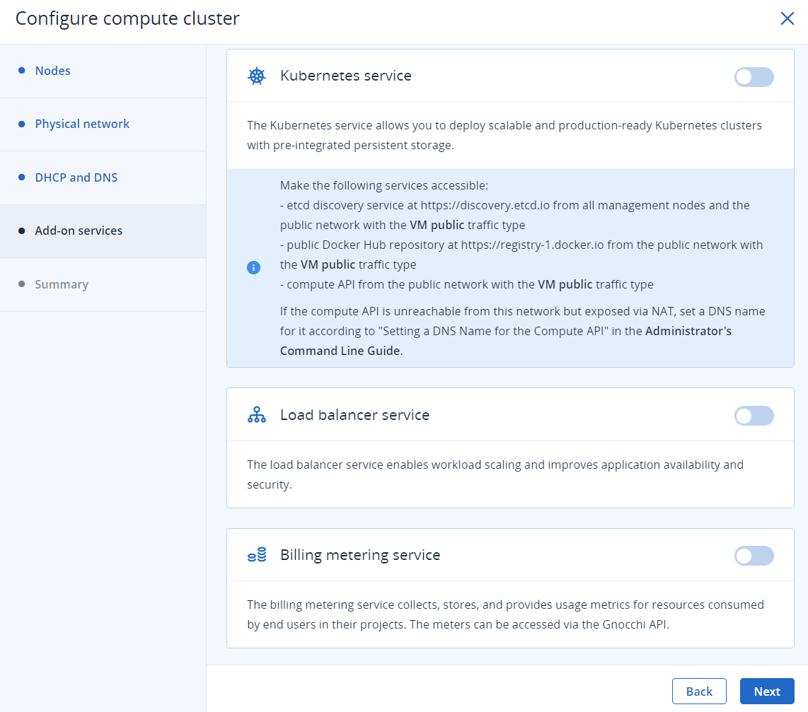 On the Add-on services step, enable the additional services that will be installed during the compute cluster deployment. You can also install these services later. Then, click Next.