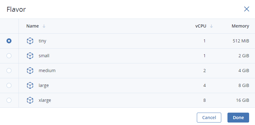 Choose the amount of RAM and CPU resources that will be allocated to the VM in the Flavor section. In the Flavor window, select a flavor, and then click Done.