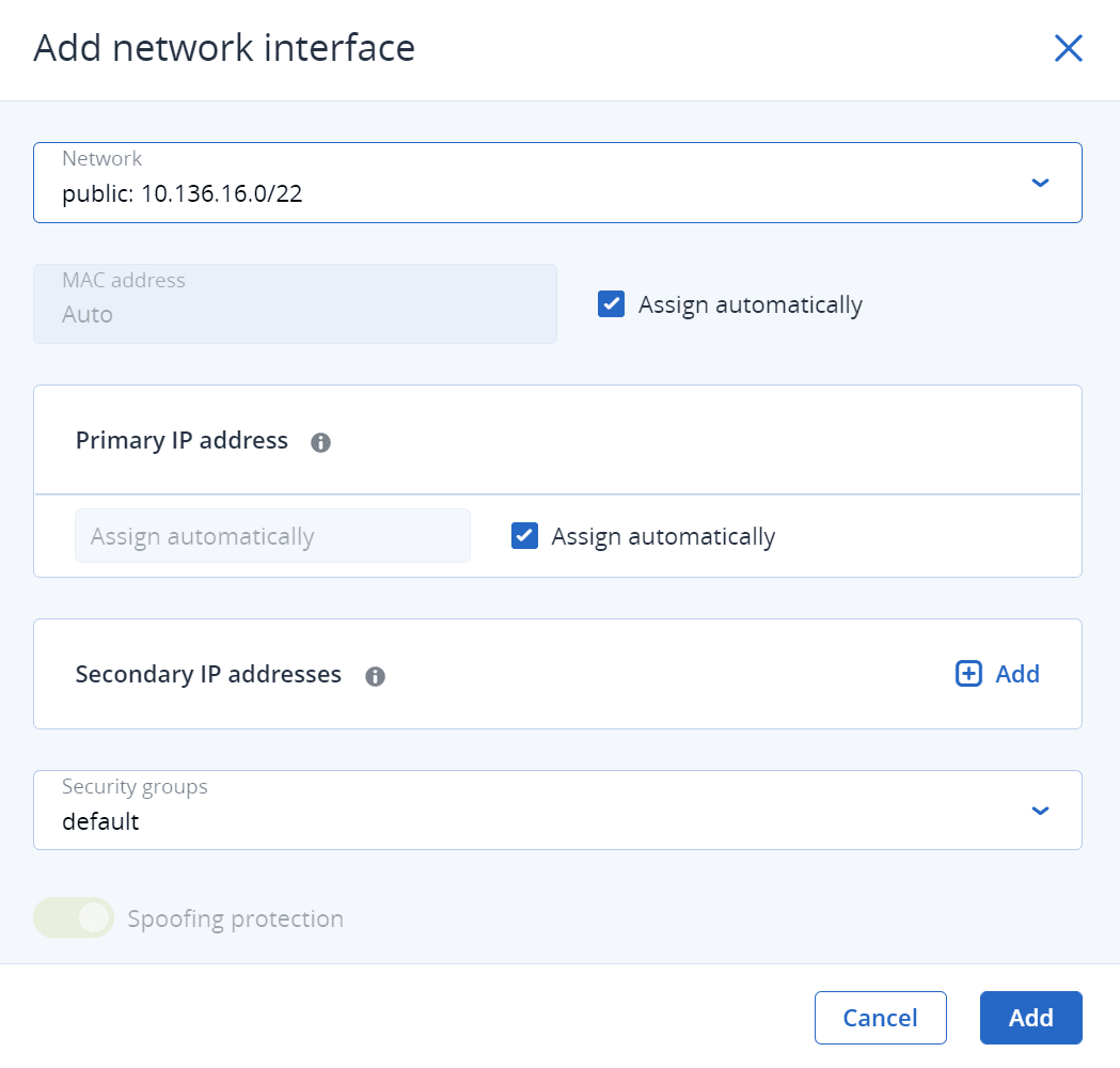 In the Add network interface window, select a compute network to connect to, and then specify MAC address, IP addresses, and security groups. By default, MAC and primary IP addresses are assigned automatically. To specify them manually, clear the Assign automatically check boxes, and enter the desired addresses. Optionally, assign additional IP addresses to the network interface in the Secondary IP addresses section.