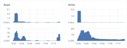The Read and Write charts show the history of the cluster I/O activity as the speed of read and write I/O operations in megabytes per second, and the number of read and write I/O operations per second (IOPS). For example: