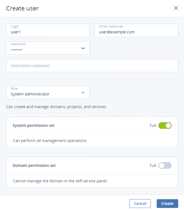 - In the Create user window, specify the user name, password, and, if required, a user email address and description. The user name must be unique within a domain.