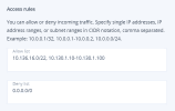 - To allow traffic from particular IP addresses, IP address ranges, or subnets, specify them in the Allow list section. Additionally, specify 0.0.0.0/0 in the Deny list section, to block all other traffic.