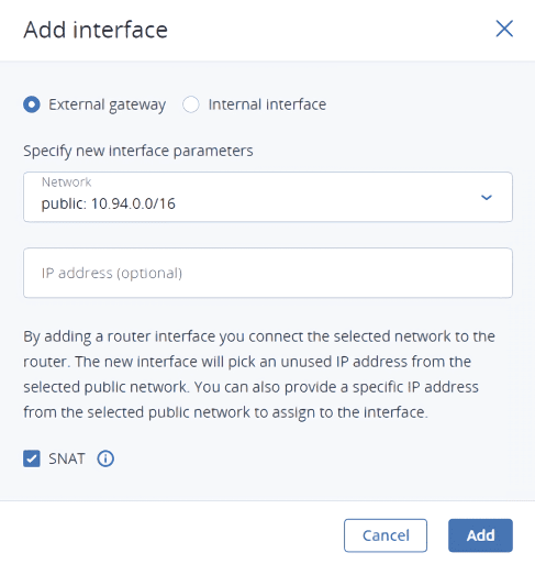 Select or deselect the SNAT check box to enable or disable SNAT on the external gateway of the router. With SNAT enabled, the router replaces VM private IP addresses with the public IP address of its external gateway.