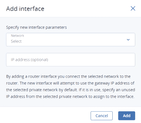 In the Add interface window, select a network to connect to the router from the Network drop-down menu. The new interface will attempt to use the gateway IP address of the selected virtual network by default. If it is in use, specify an unused IP address from the selected virtual network to assign to the interface in the IP address field.