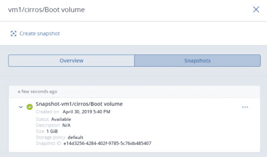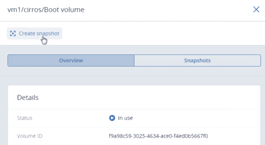You can save the current state of a VM file system or user data by creating a snapshot of a volume. A snapshot of a boot volume may be useful, for example, before updating VM software. If anything goes wrong, you will be able to revert the VM to a working state at any time. A snapshot of a data volume can be used for backing up user data and testing purposes.