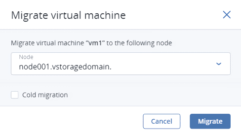By default, running VMs are migrated live. You can change the migration mode to offline by selecting the Cold migration check box. A VM will be stopped and restarted on the destination node after migration.