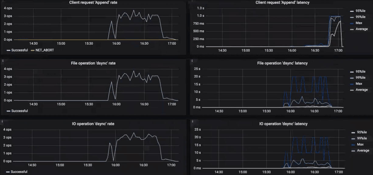 - The Append latency chart shows the time spent on processing requests and should average several tens of milliseconds with peak values below one second.