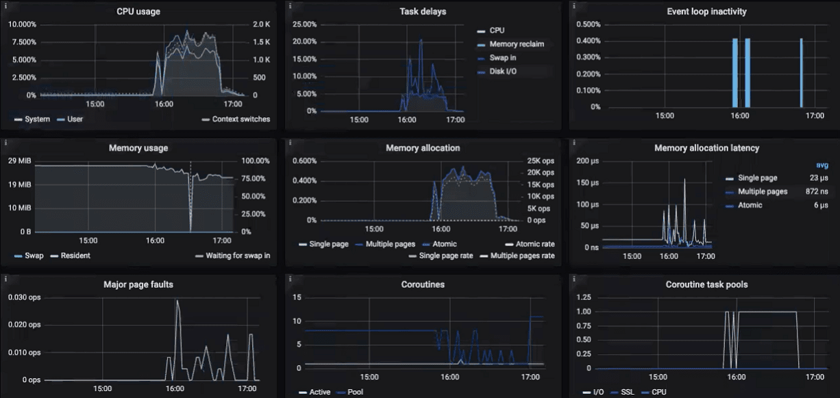 - CPU/RAM: CPU usage in percent over time, and RAM usage, in GiB over time