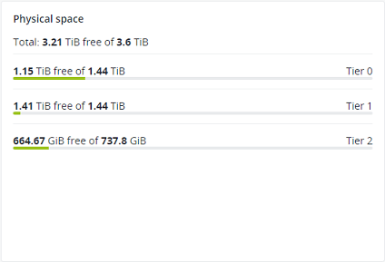 The Physical space chart shows the current usage of physical space in the entire storage cluster and on each particular tier. The used space includes the space occupied by all data chunks and their replicas, plus the space occupied by any other data.