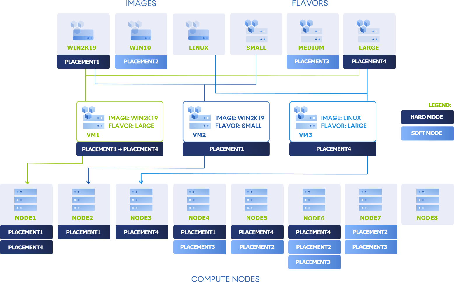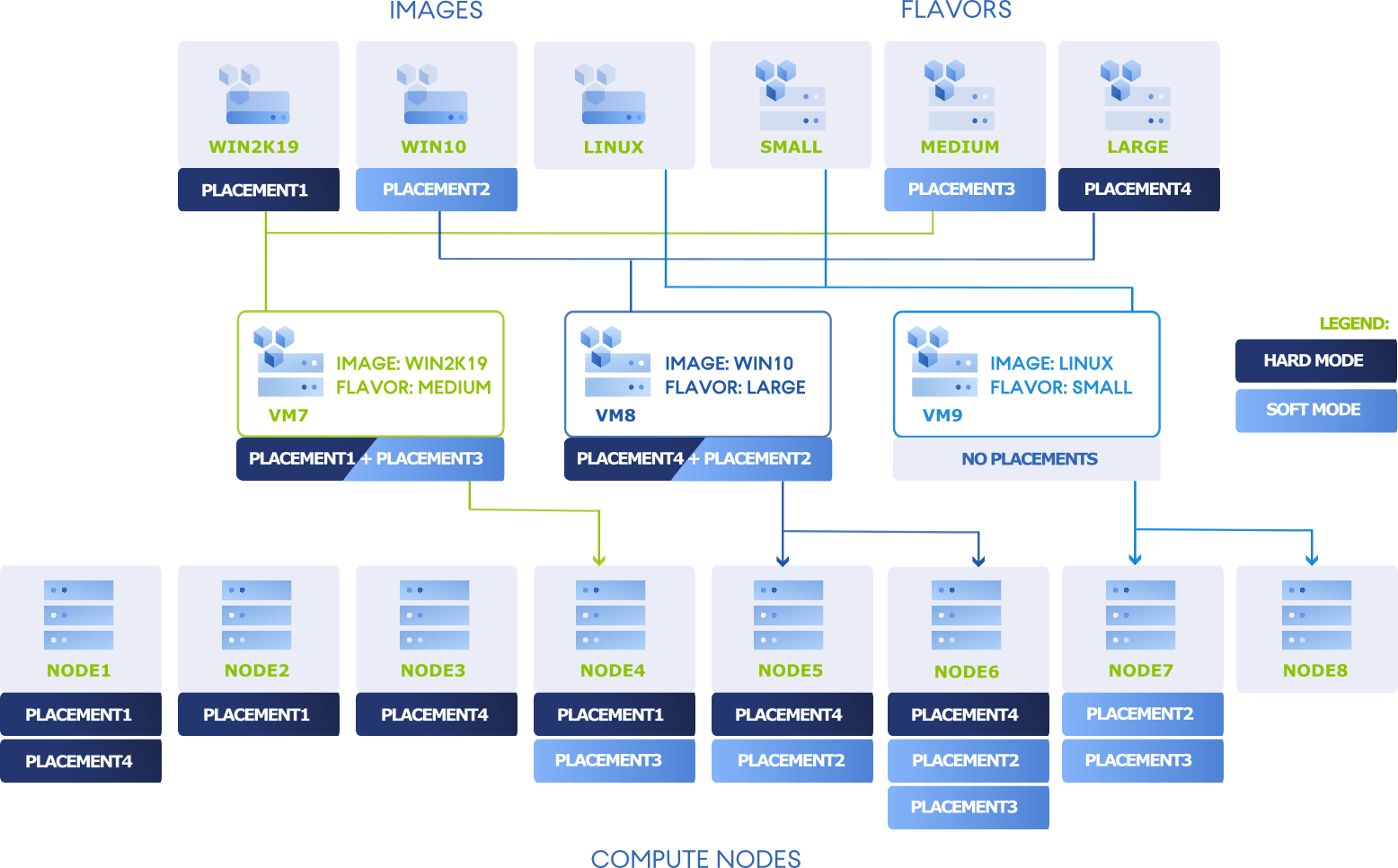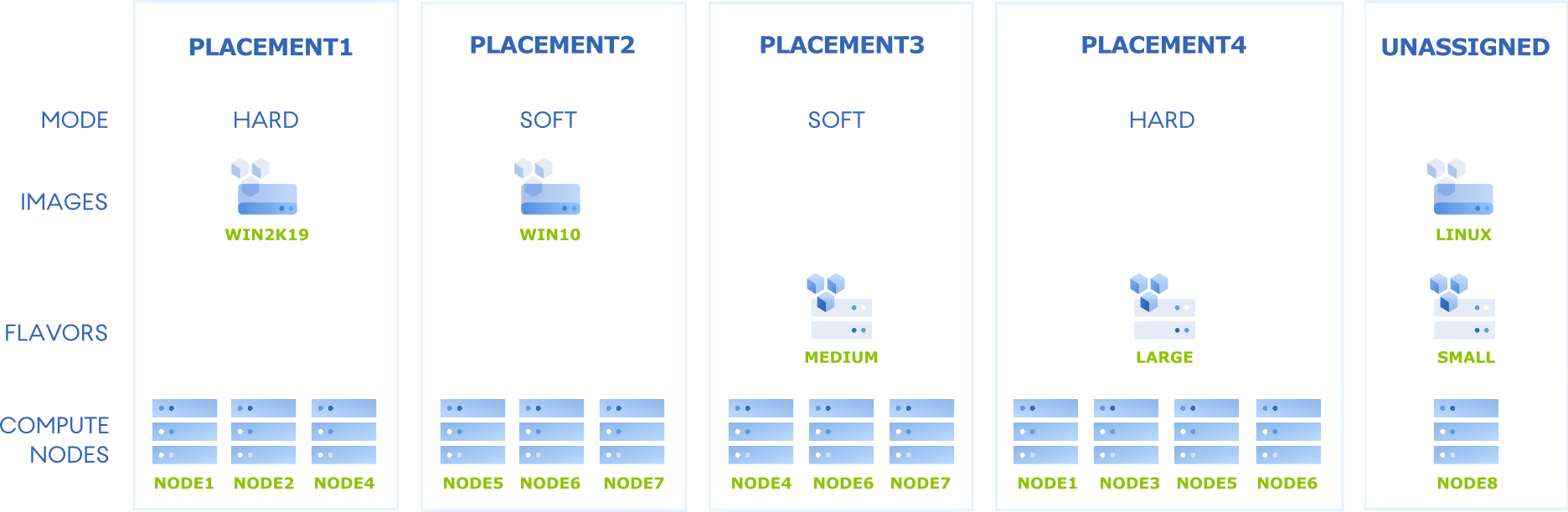 Placements for compute nodes have two modes: hard and soft. The hard mode is the default one. To better understand how these modes work, let's consider an example when a system administrator creates placements and assigns them to images, flavors, and nodes as follows: