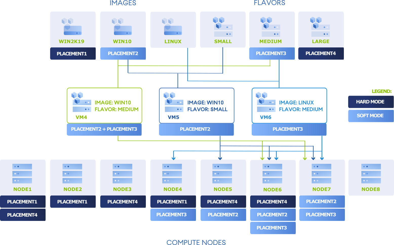 - VM8 is created from the Win10 image with Placement2 and the Large flavor with Placement4. The VM inherits Placement4 in the hard mode and Placement2 in the soft mode. VM7 can be placed on Node5 and Node6 because these nodes have both Placement2 and Placement4 assigned.