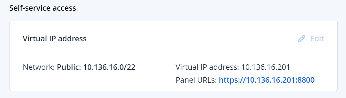 You can now access the self-service panel at http://<admin_panel_IP_address>:8800. Use the domain name and user credentials to log in. If high availability for the management node is enabled, log in into the self-service panel by using the virtual address for the admin panel: http://<admin_panel_virtual_IP_address>:8800. You can also use the link in the Panel URLs field on the Settings > System settings > Self-service screen.