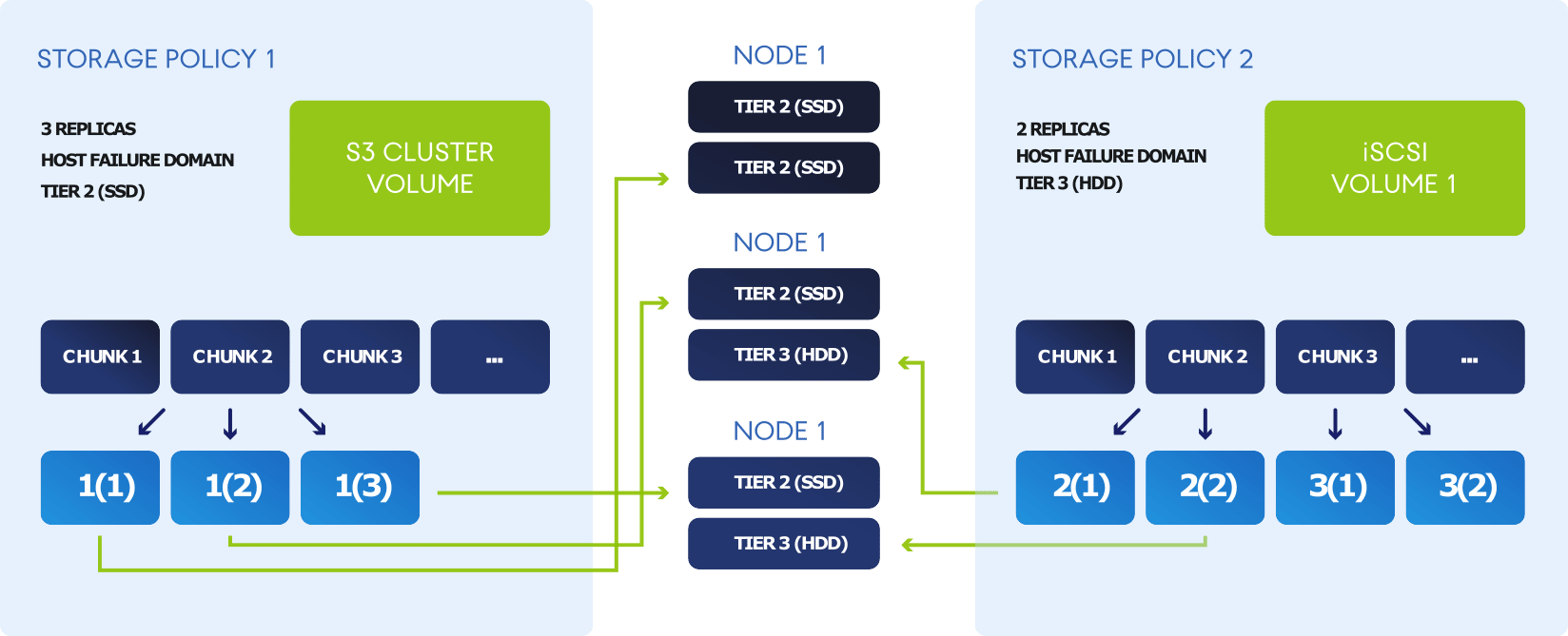 To better understand a storage policy, let’s have a look at its main components (tiers, failure domains, and redundancy), for a sample scenario. For example, you have three nodes with a number of storage nodes: fast SSDs and high-capacity HDDs. Node 1 has only SSDs; nodes 2 and 3 have both SSDs and HDDs. You want to export storage space via iSCSI and S3, so you need to define a suitable storage policy for each workload.